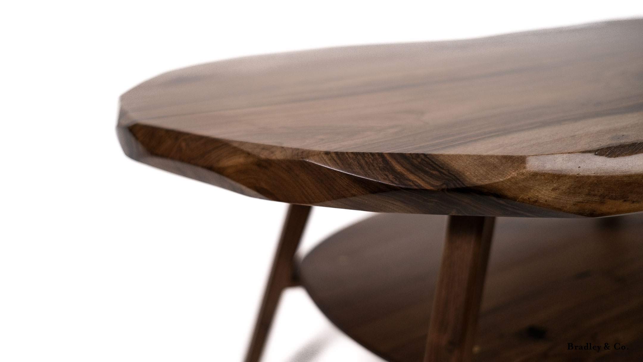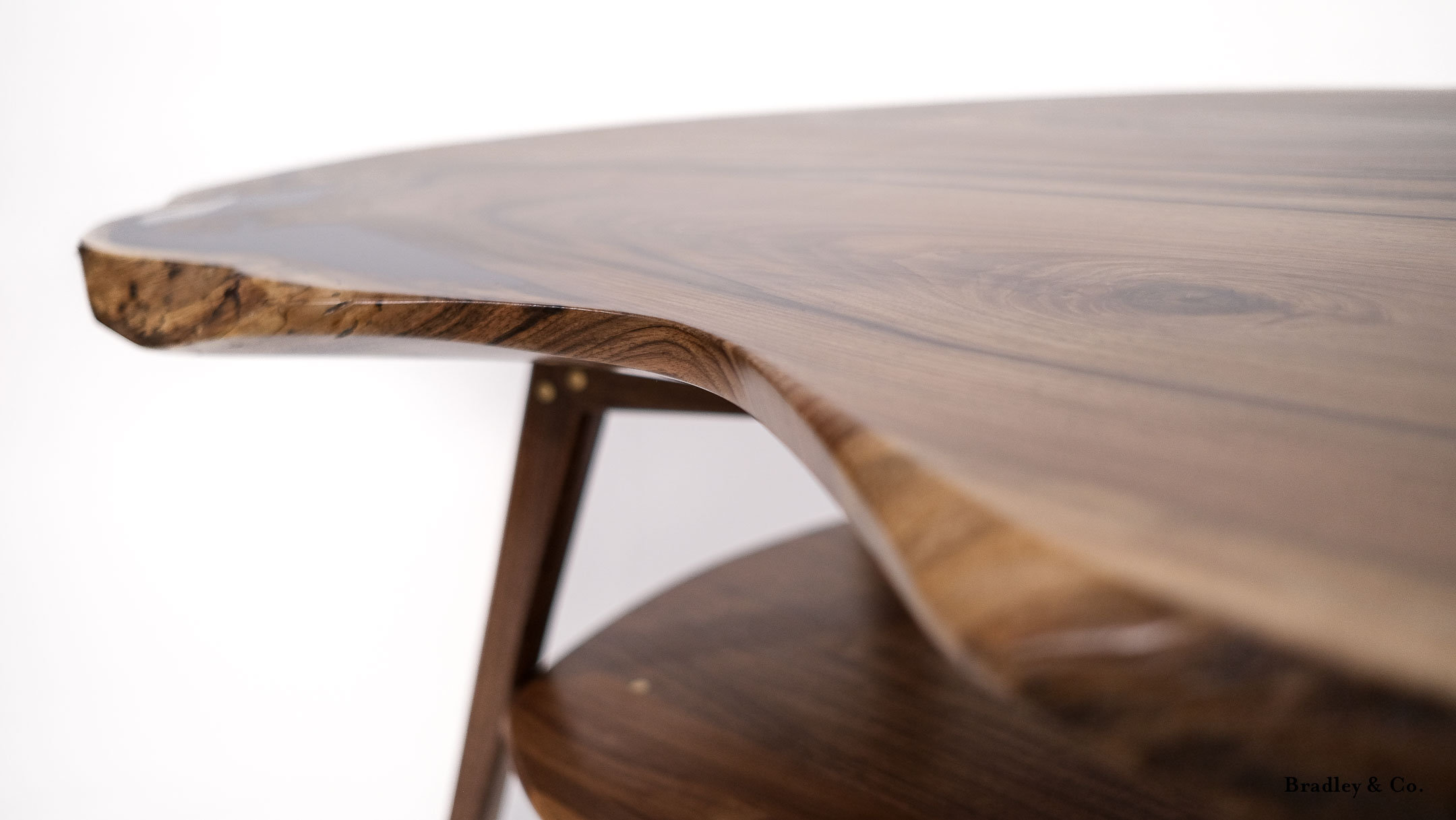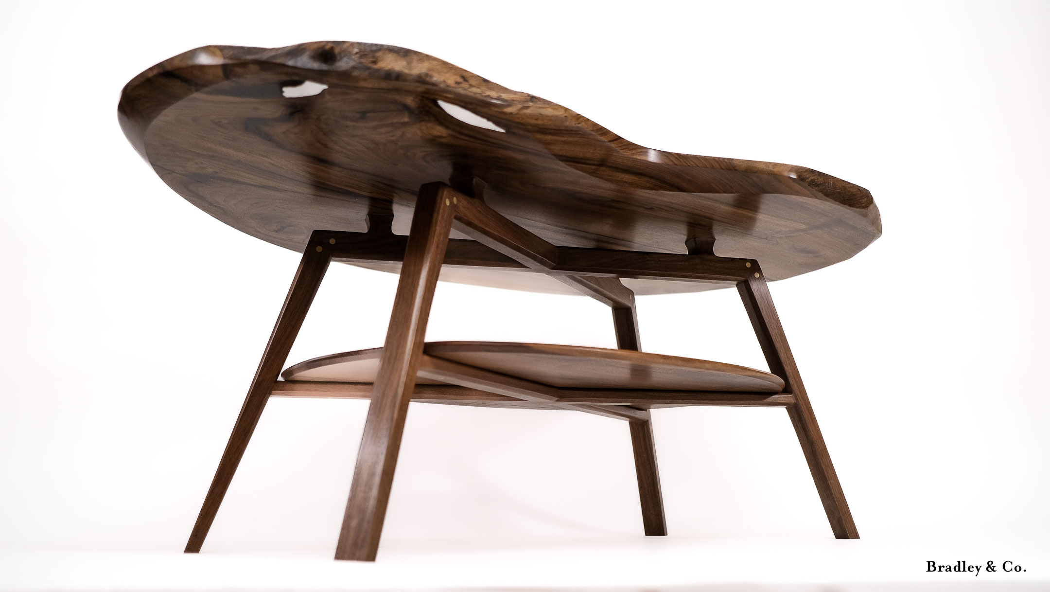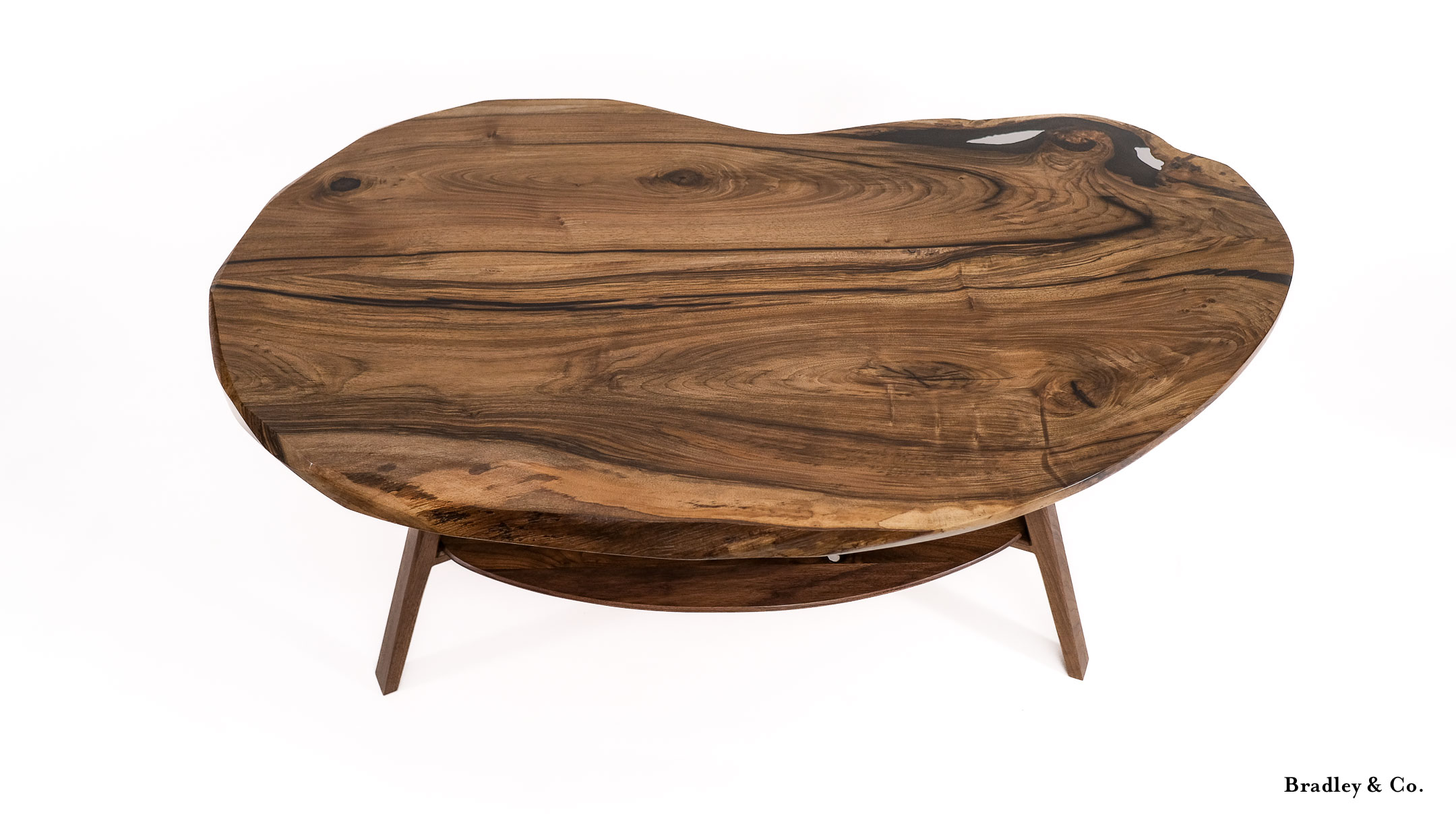Shaped live-edge walnut with tapered legs and a shelf.