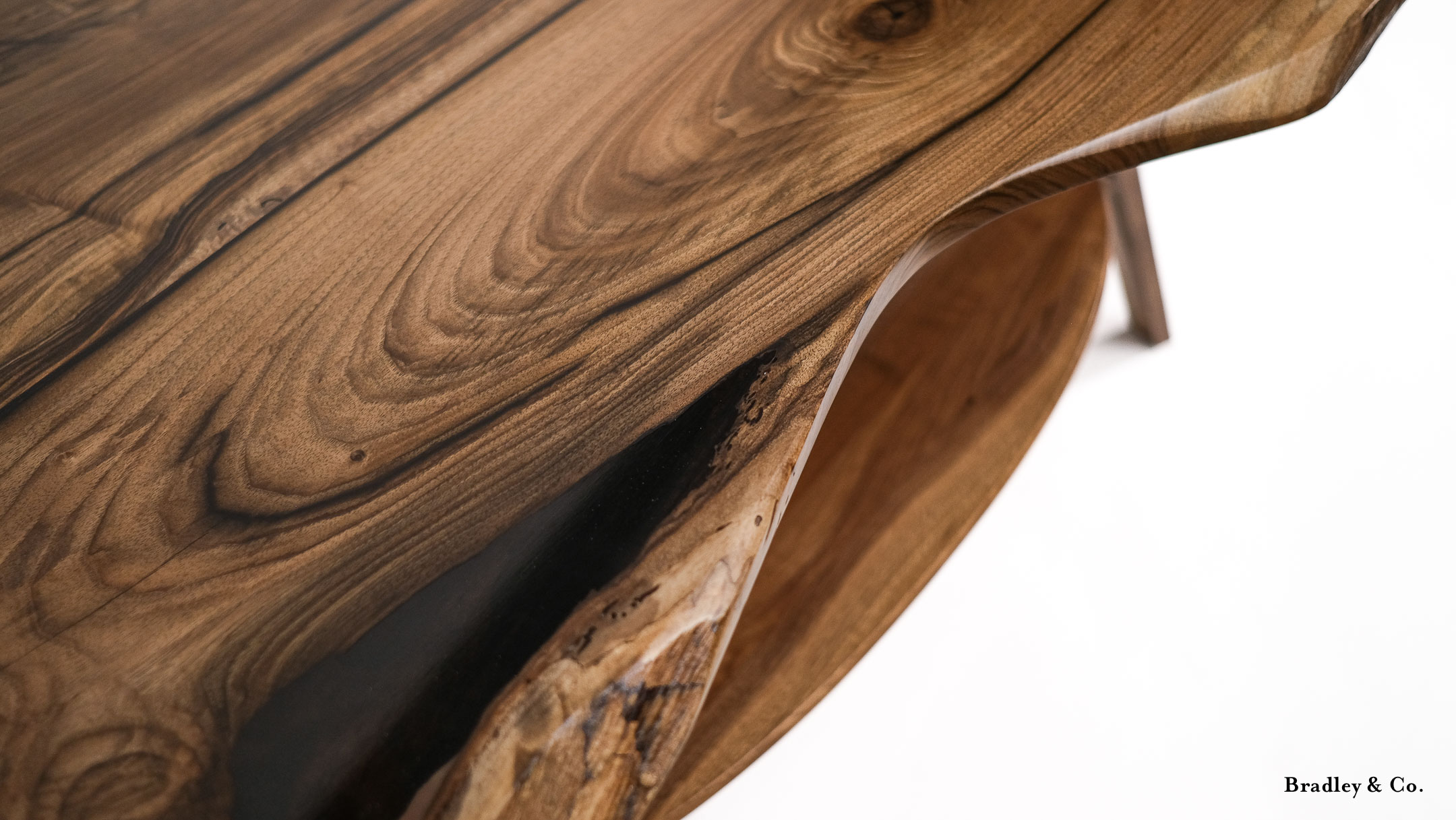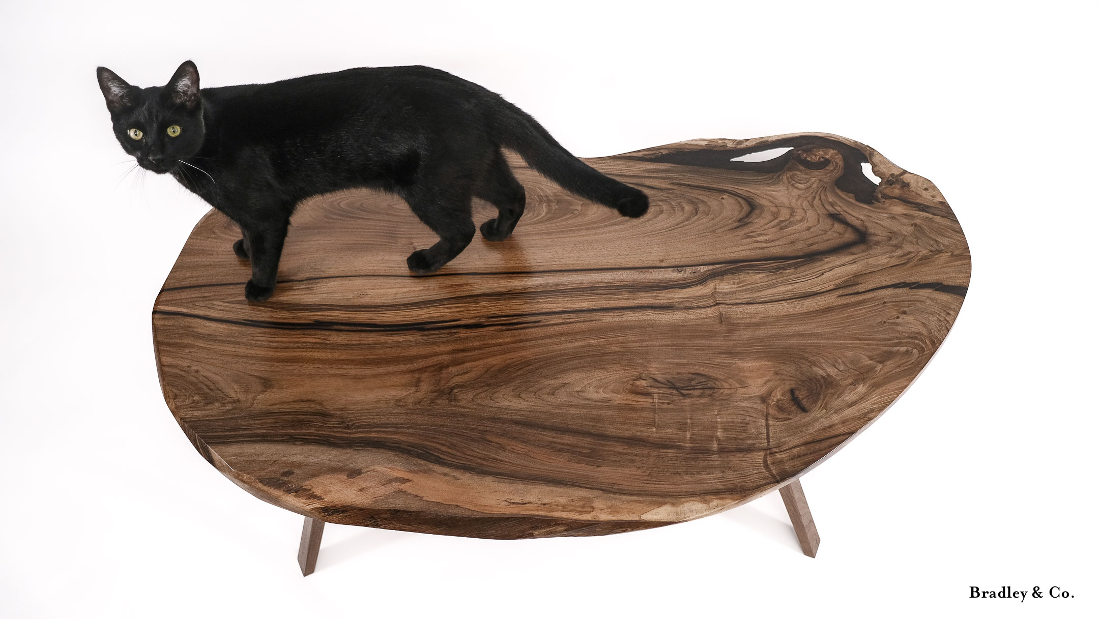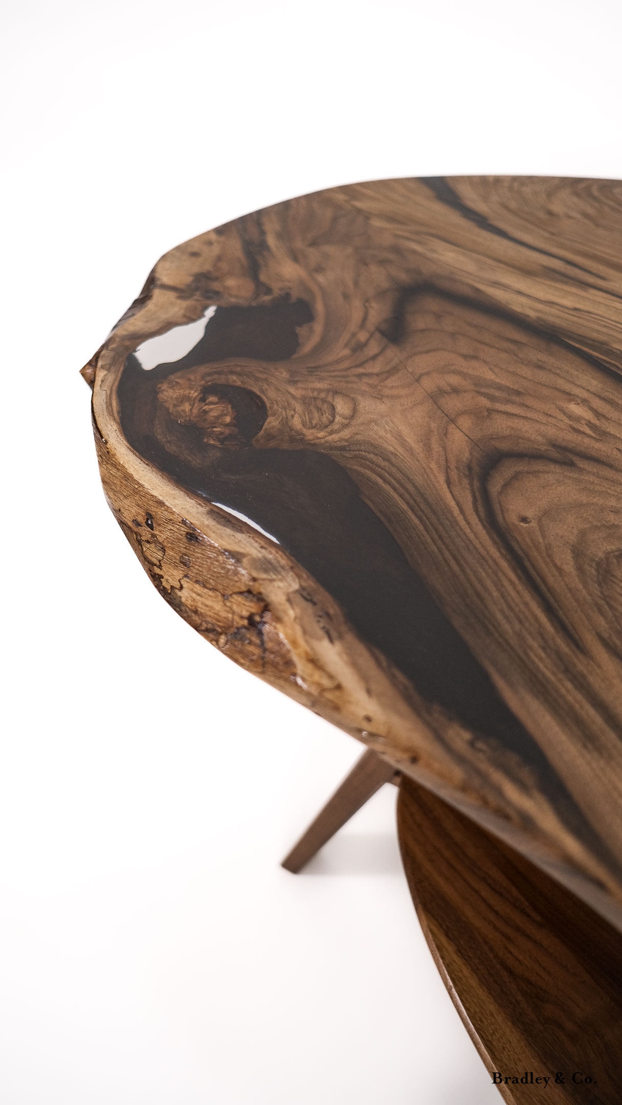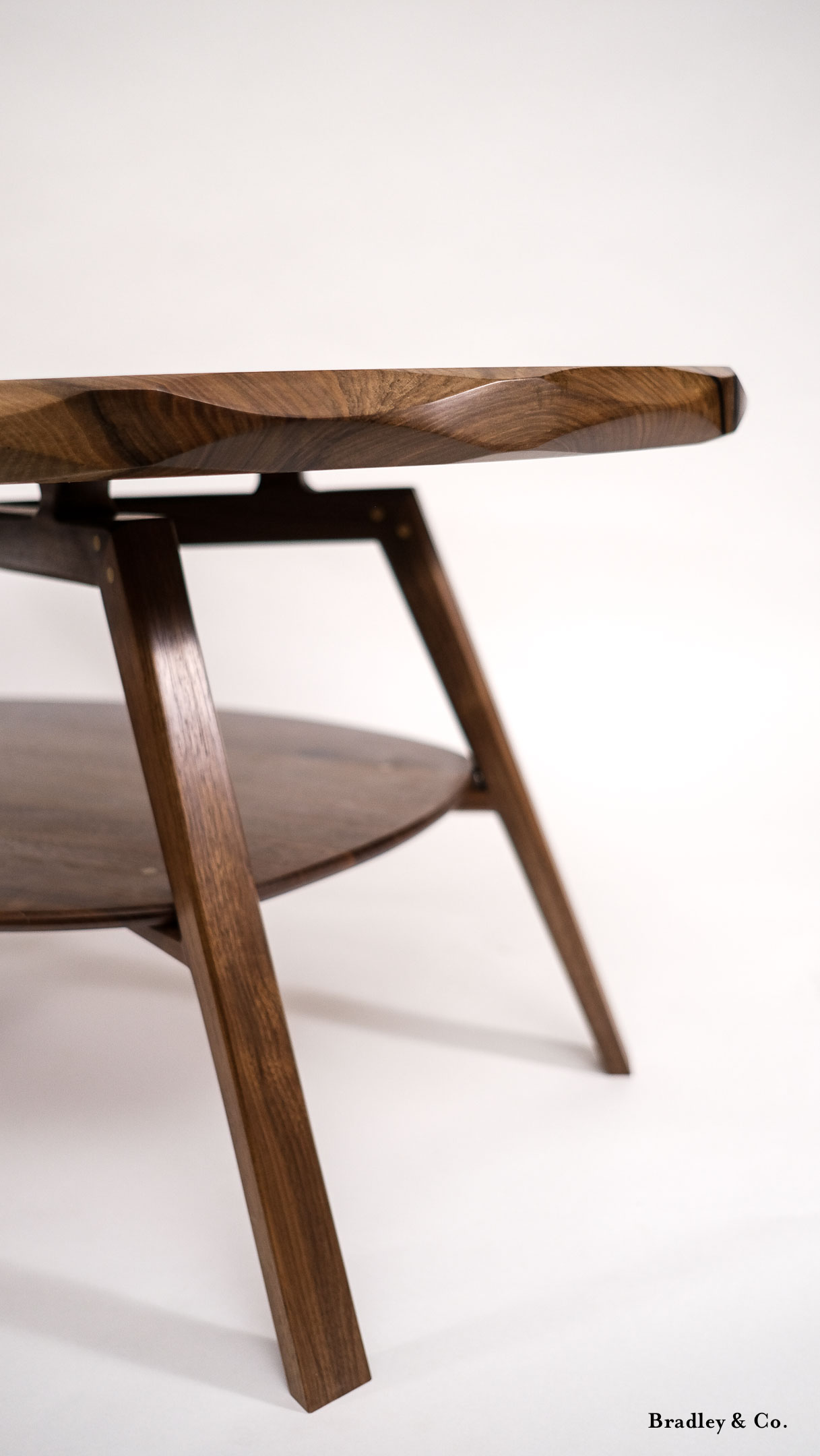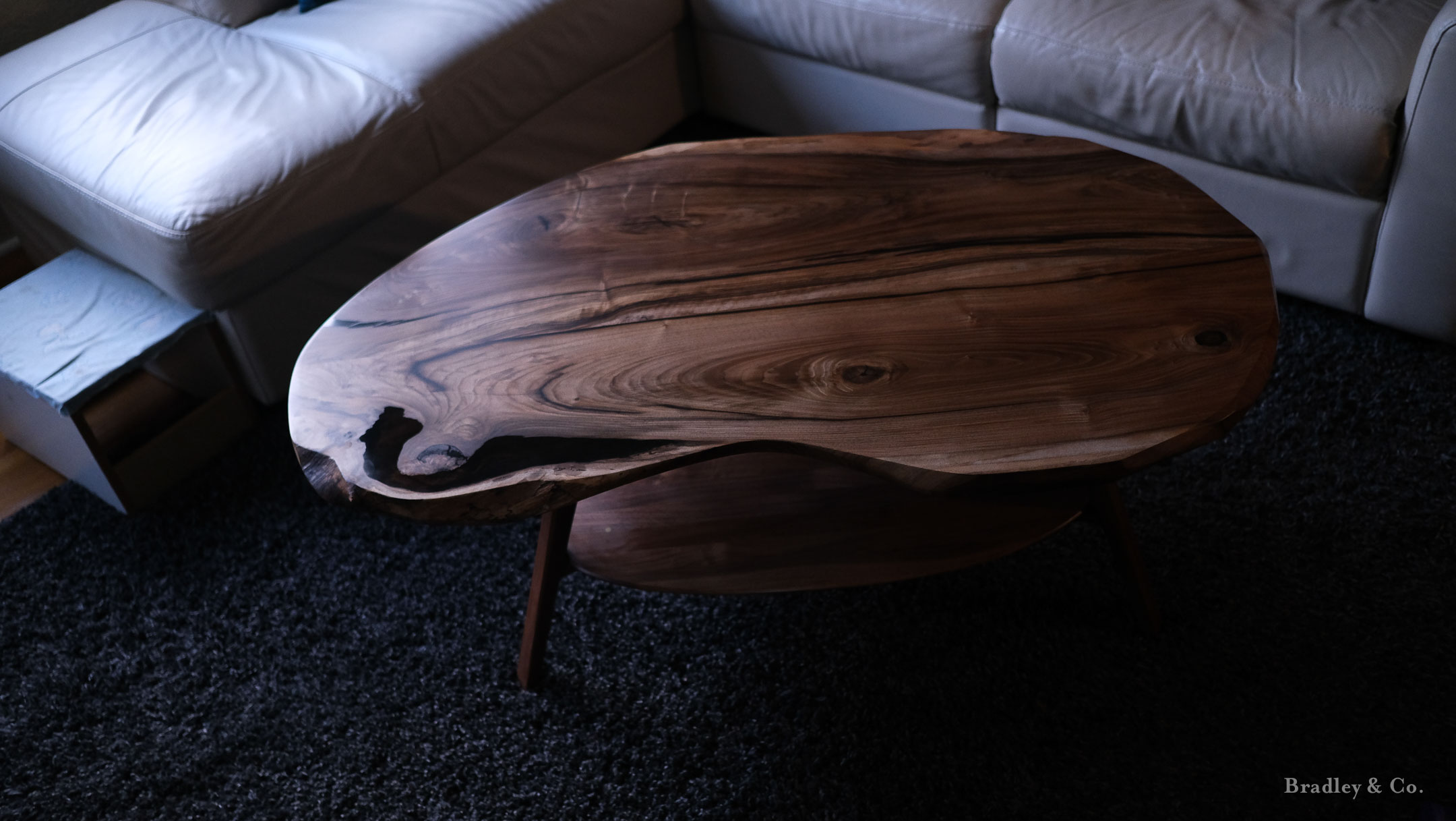 Shaped live-edge walnut with tapered legs and a shelf.